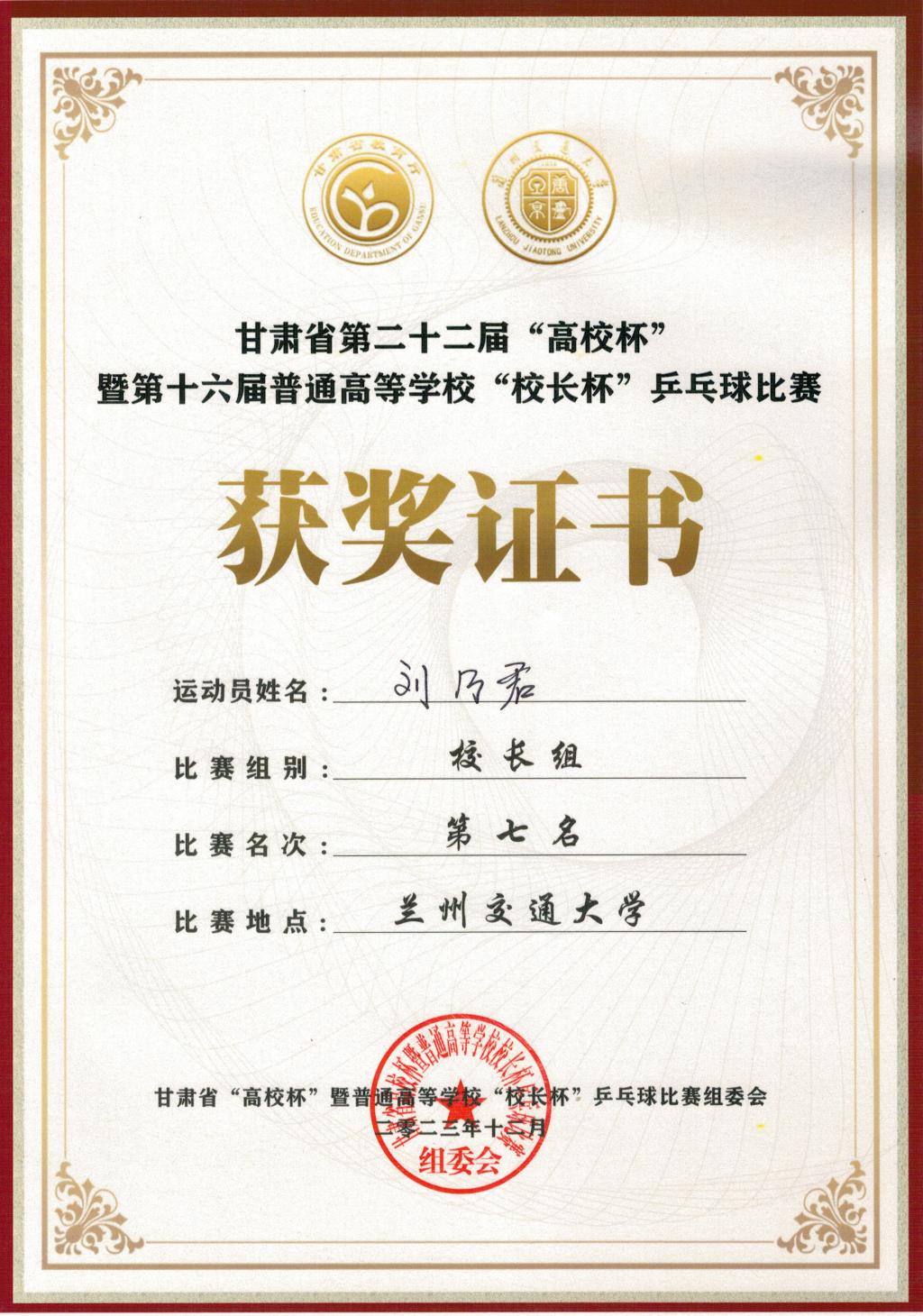 12月7日至9日,2023年甘肃省第二十二届高校杯暨第十六届普通高等学校“校长杯”乒乓球比赛在兰州交通大学举行。校工会组队参加了“校长组”和“教职工团体赛组”的比赛,副书记刘乃君参加了“校长组”并获得第七名的好成绩。