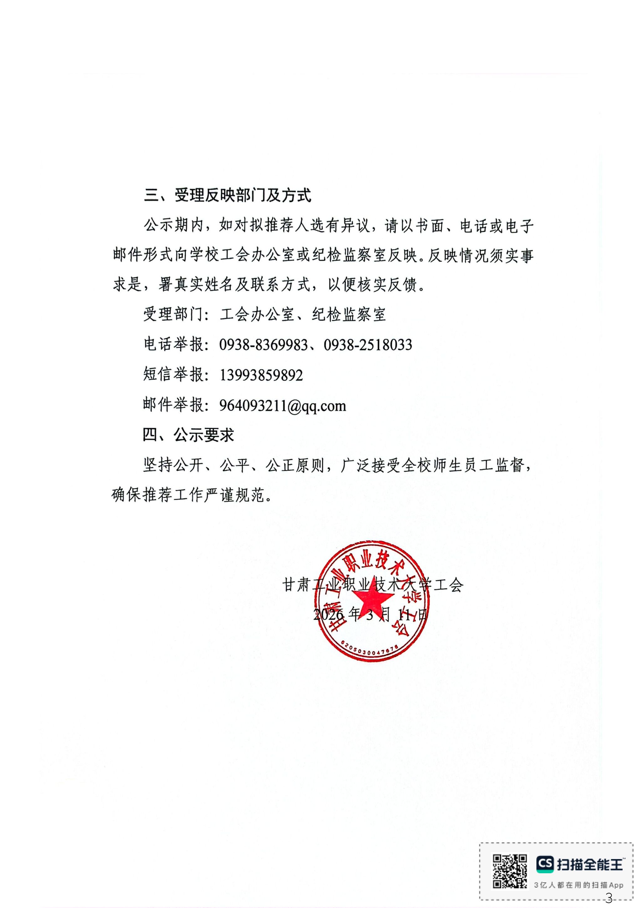 公示期内,如对拟推荐人选有异议,请以书面、电话或电子邮件形式向学校工会办公室或纪检监察室反映。反映情况须实事求是,署真实姓名及联系方式,以便核实反馈。