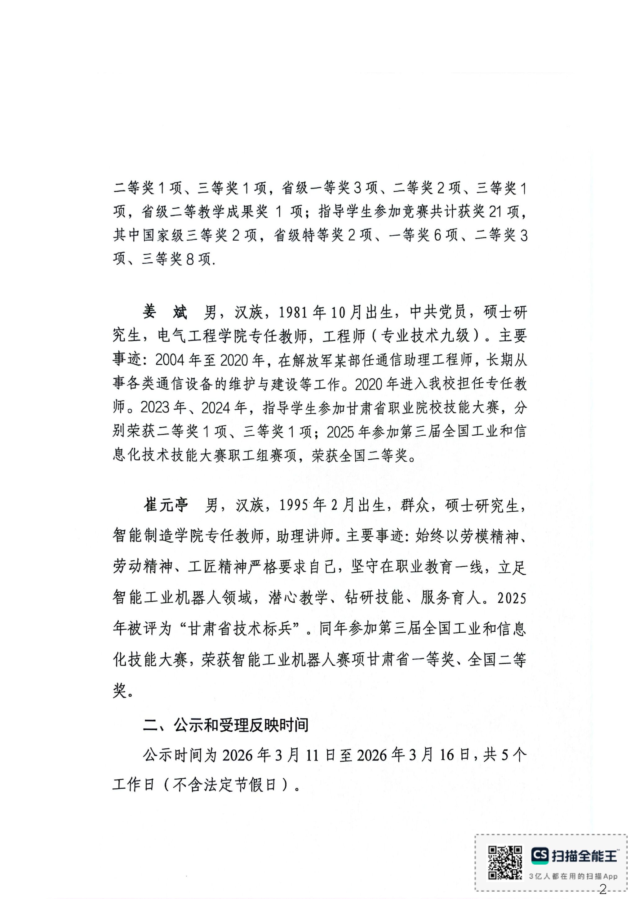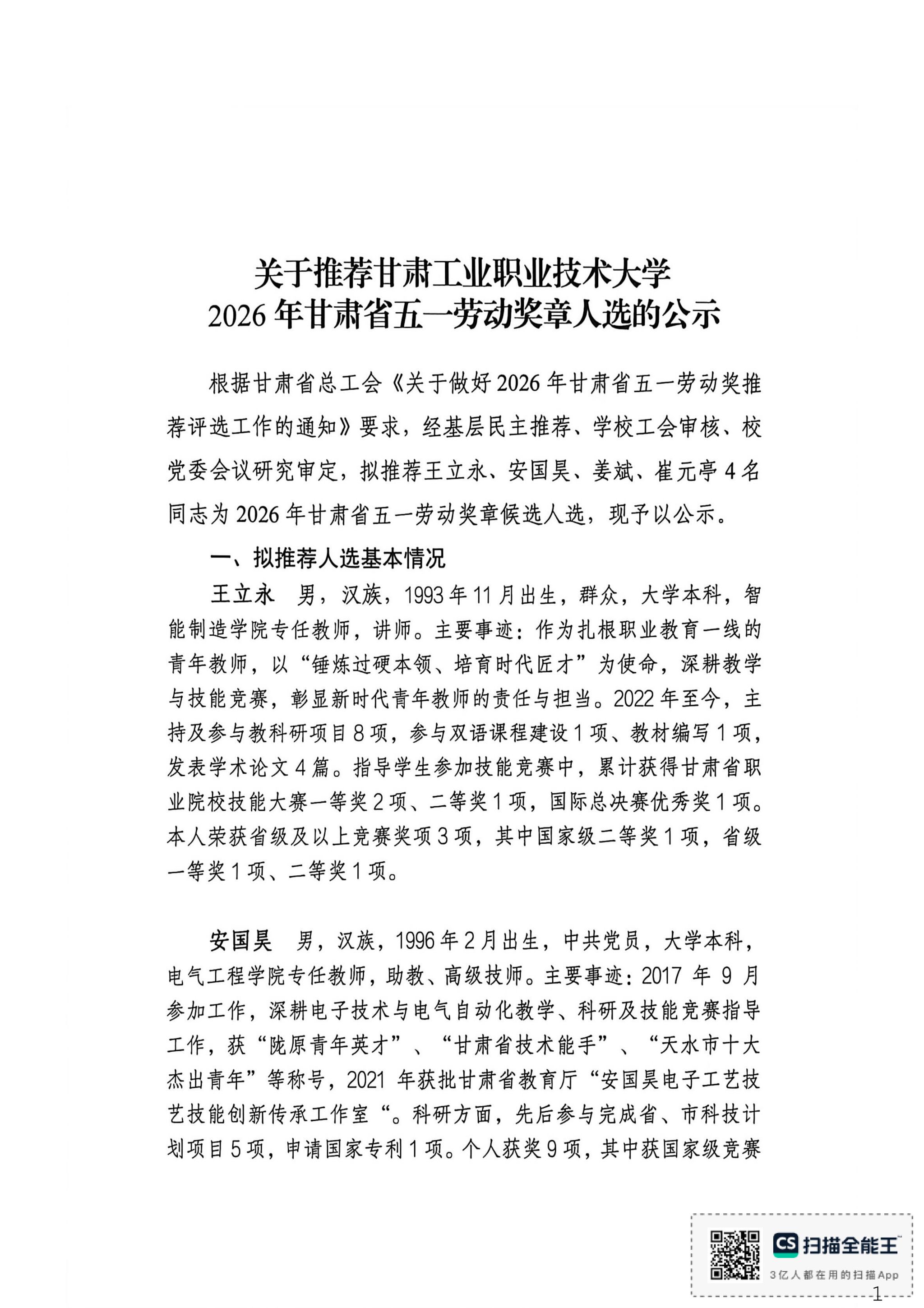 关于推荐甘肃工业职业技术大学 2026年甘肃省五一劳动奖章人选的公示
